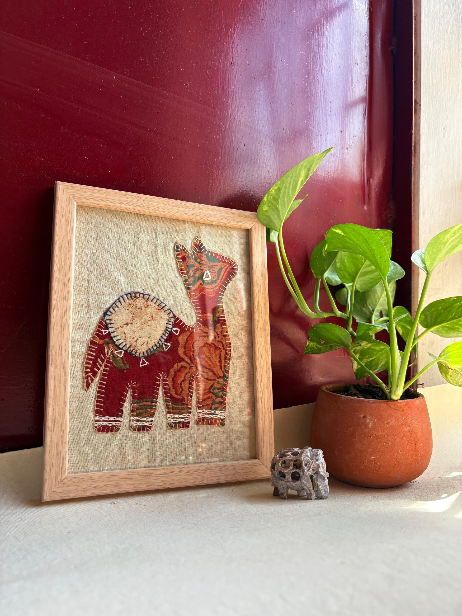 Our applique paintings are individual works of art, where fabric scraps are thoughtfully layered and stitched onto a backing to create vibrant and tactile compositions. The process of applique brings a unique three-dimensional element to traditional painting. By utilizing upcycled fabric scraps, each piece is not only visually interesting but also a testament to sustainable practices, giving new life to textile remnants.