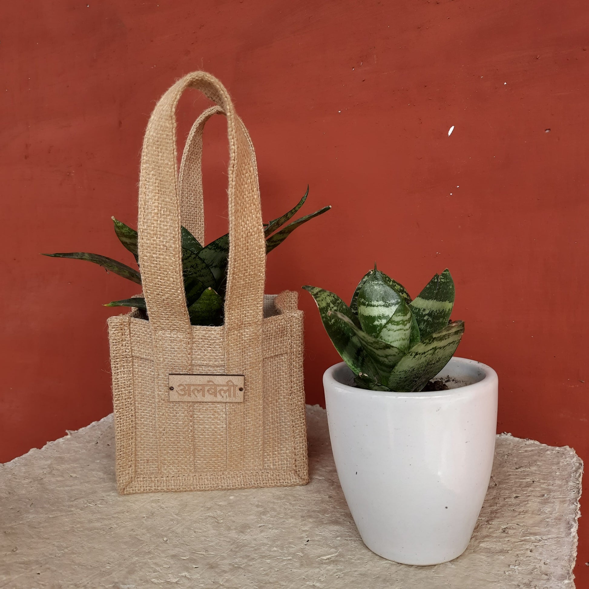 Material Used: Snake Plant, Ceramic Pot, Jute Fabric (for bag)