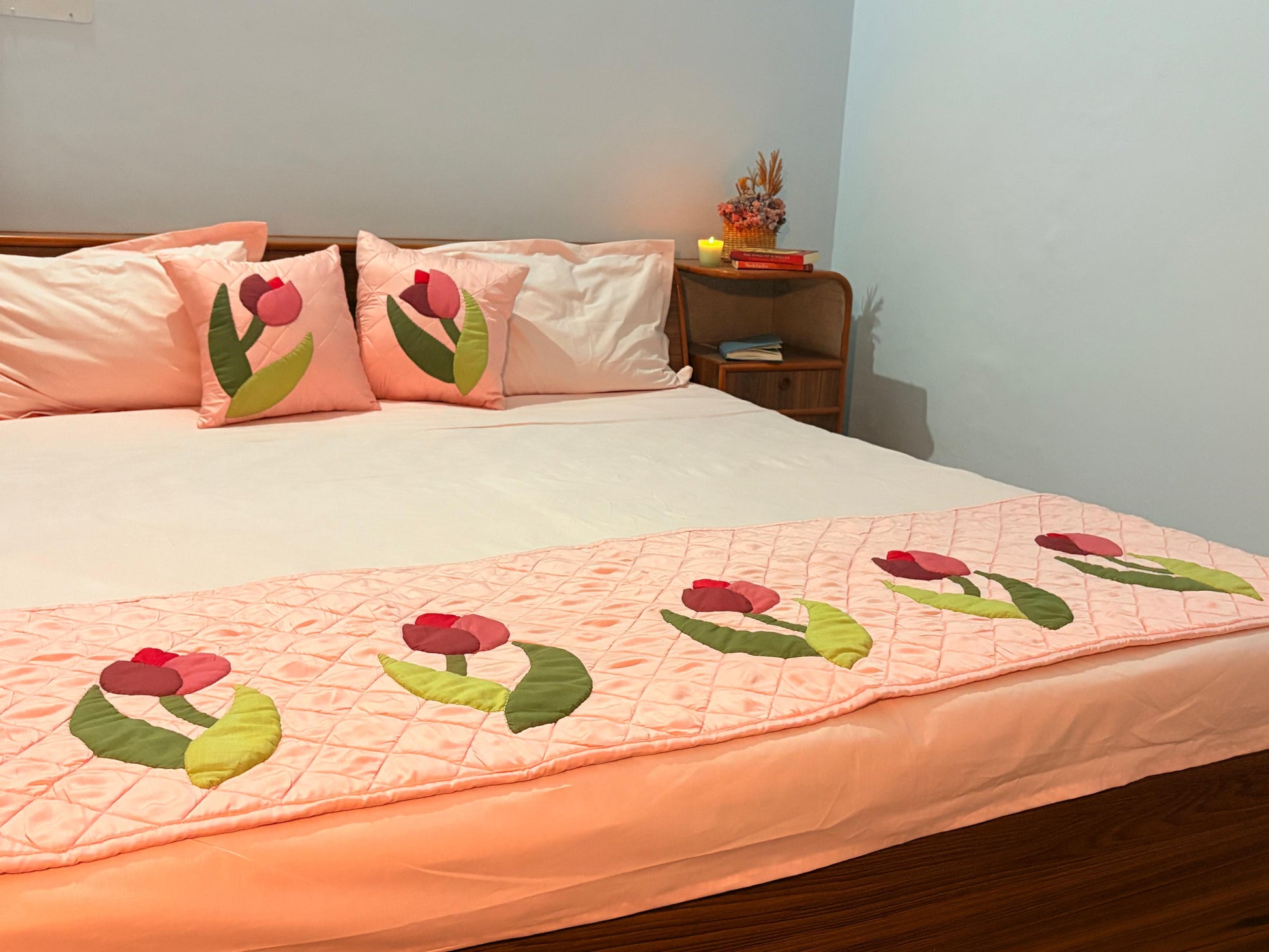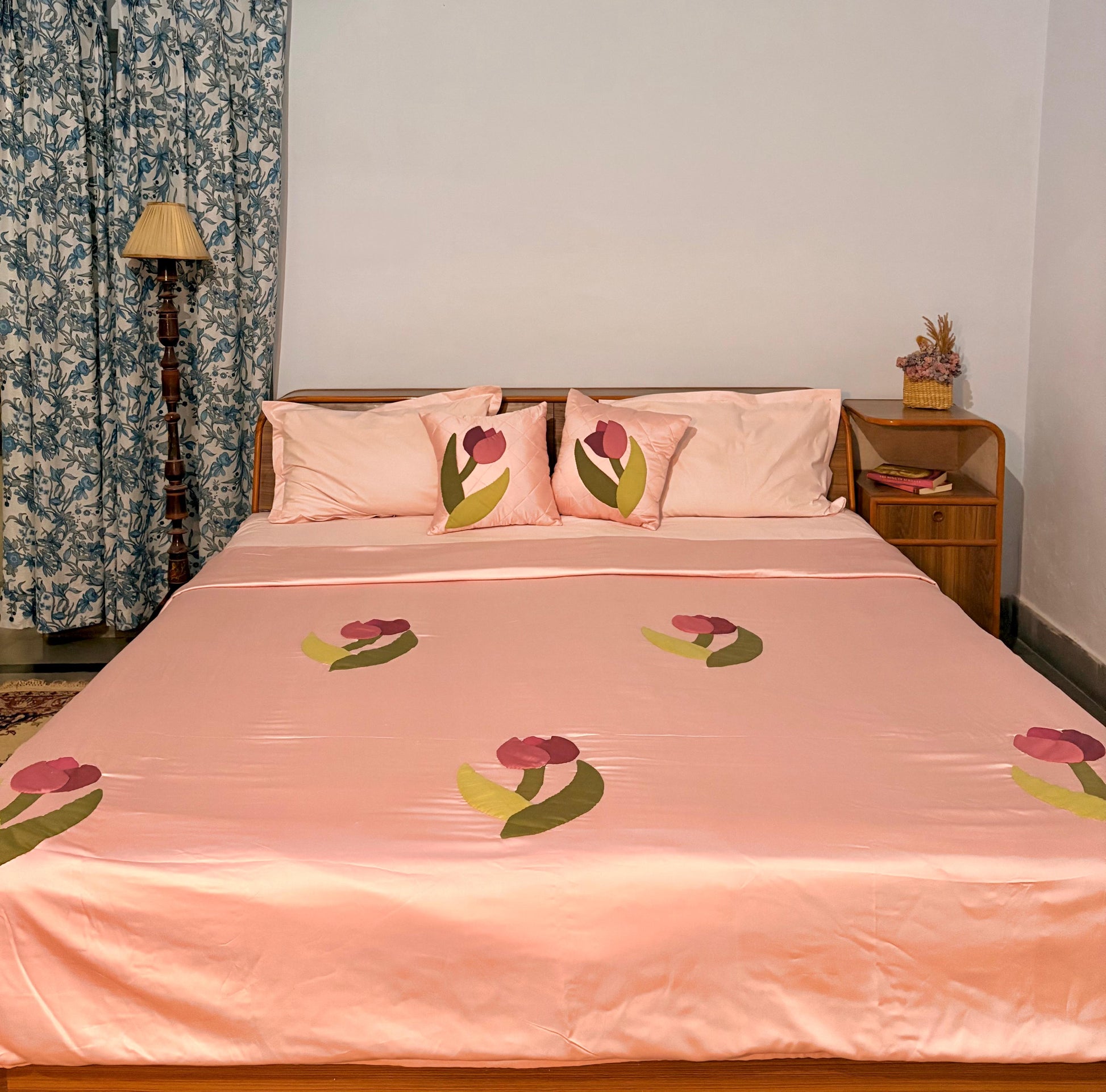 Indulge in the smooth touch of glace cotton plain bedsheet and the subtle sheen of the cotton satin accents in this spring-inspired collection. The beautiful applique motifs, tulip flowers, are carefully stitched onto the fabric, adding a layer of texture and visual interest. The intricate quilting enhances the softness and creates a cozy feel. This complete bedding set is a testament to sustainable craftsmanship and timeless design.
